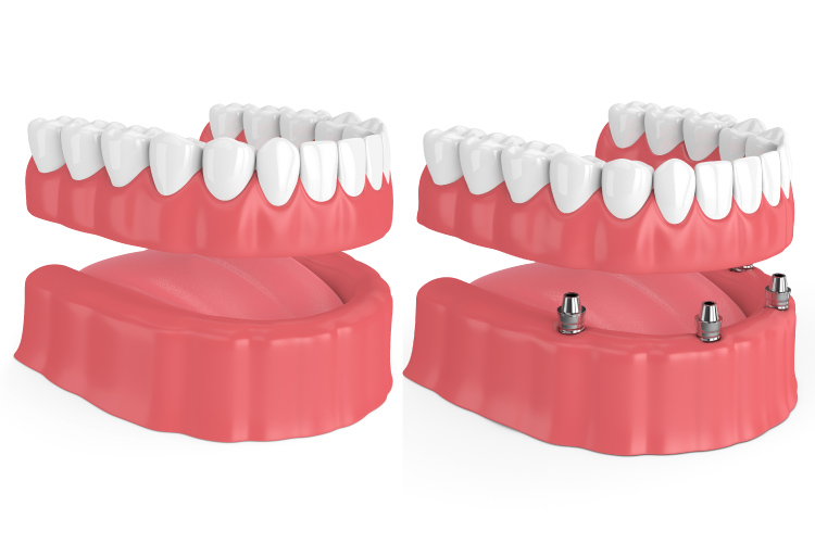 While implants are fixed and they replicate your natural teeth, so they don’t move just like your natural teeth while eating