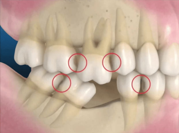 As it moves, the two teeth adjacent to it will become open and develop decay because of subsequent food lodgment that will happen.